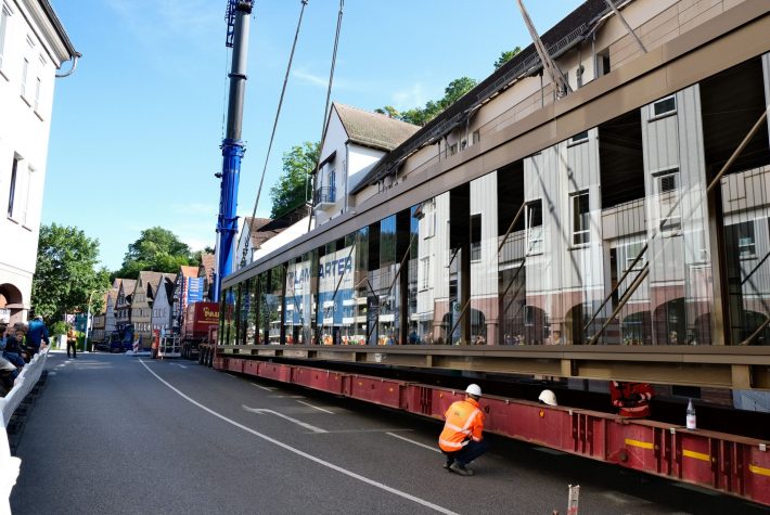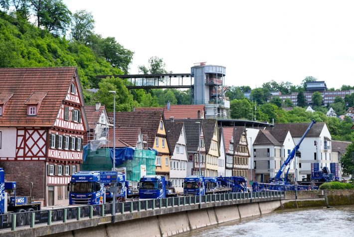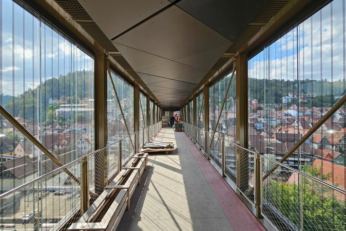 Spektakulär war die Einbringung der 30t schweren und 25m langen Fußgängerbrücke aus Glas und Stahl am „Calwer Brückentag“ im Mai 2024. Der 700t Kran – einer der größten mobilen Krane Europas – hat die Brücke eingehoben und millimetergenau abgesetzt. Das Projekt stellt einen bedeutenden Beitrag zur Revitalisierung der ehemaligen Württembergischen Schwarzwaldbahn dar.