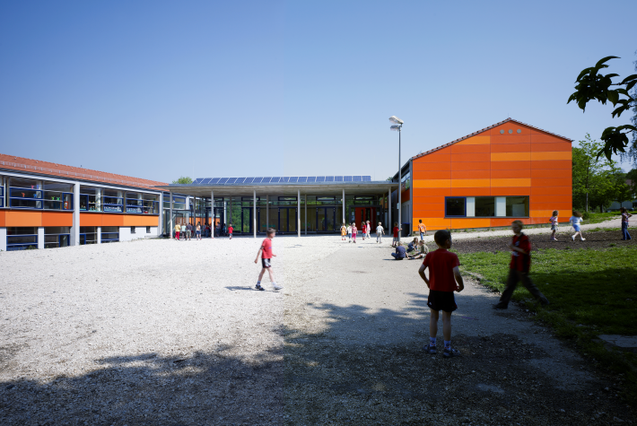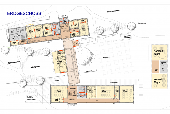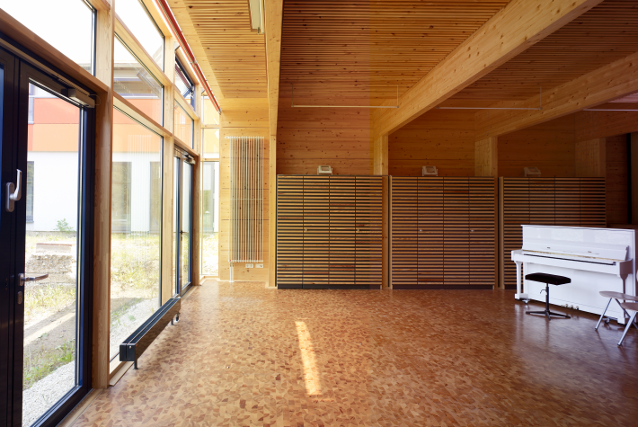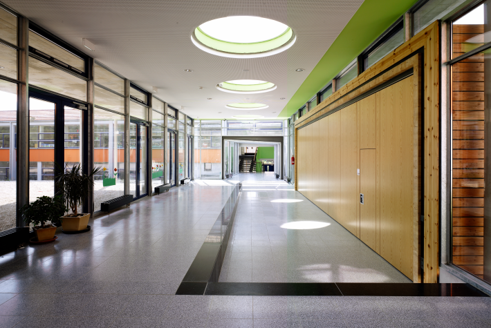 Das architektonische Herzstück der Schule bildet nun die großzügige Aula im neuen Zwischenbau in welchem durch Öffnung des Musiksaals bis zu 100 Personen für Schulaufführungen Platz finden. Von dort aus wird man in die beiden sanierten Schulgebäude geführt, deren angenehmer Charme der Entstehungszeit auch nach dem Umbau noch erlebbar bleibt.