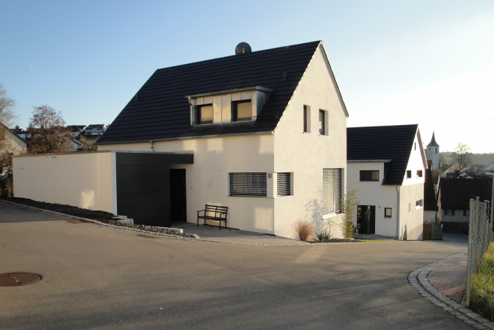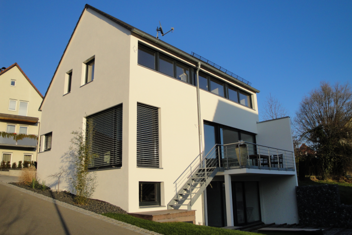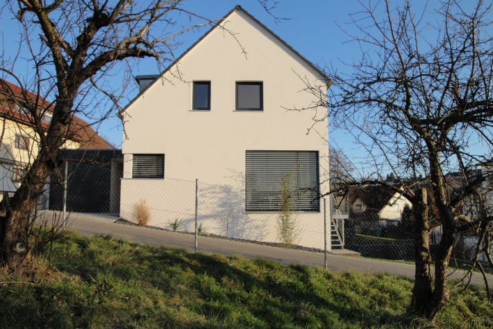 Durch die Hanglage ist das Gebäude teilweise ins Gelände eingebunden und fügt sich selbstverständlich in die Topografie ein.