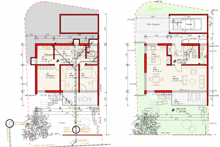 Im Untergeschoss befinden sich großzügige Neben- und Hobbyflächen mit direktem Bezug zum Außenraum. Das Erdgeschoss bildet den zentralen Lebensmittelpunkt mit offenem Wohn- und Essbereich, der sich zur Terrasse und in den Garten öffnet. Eine integrierte Garage ist funktional angebunden.